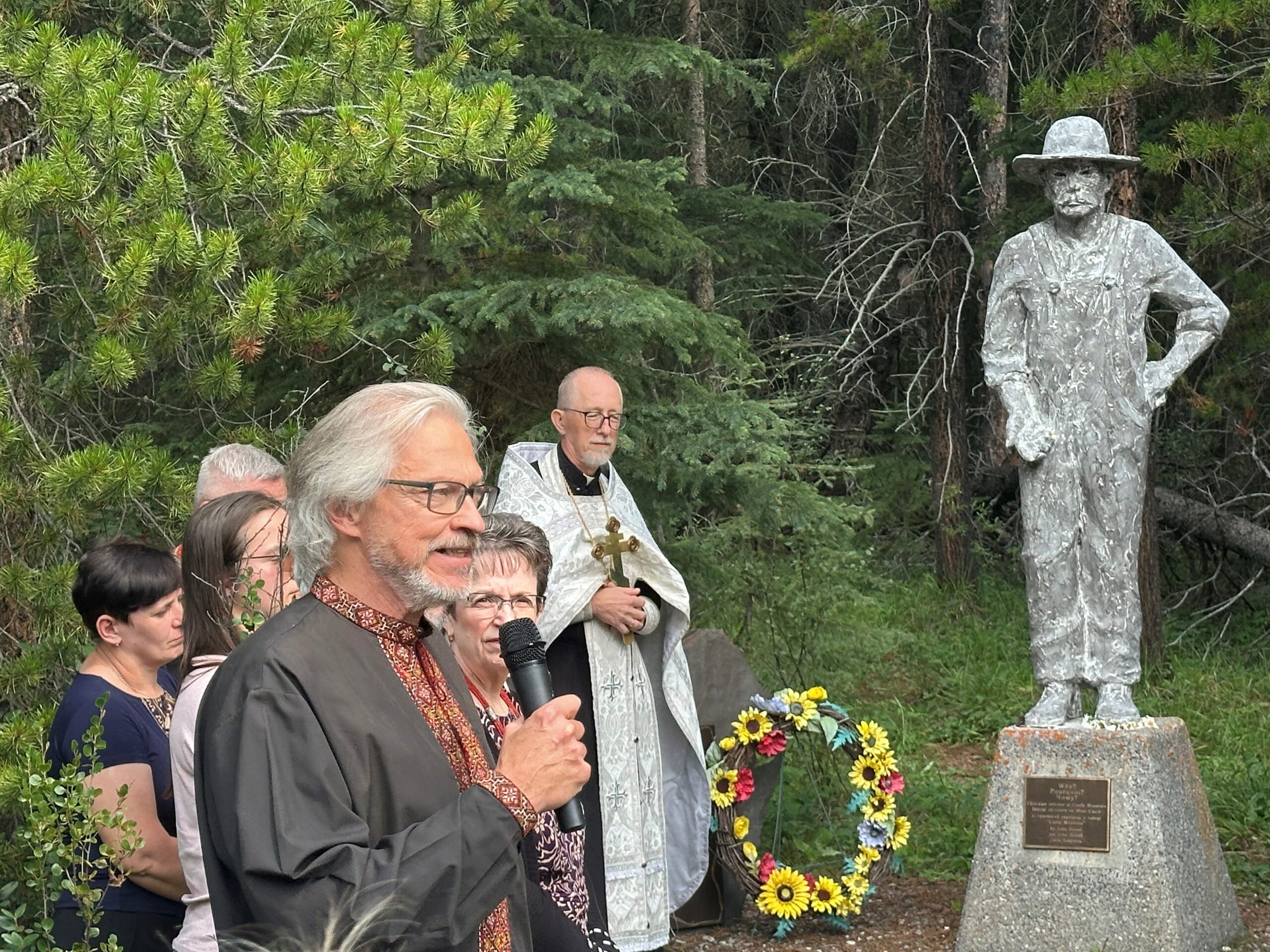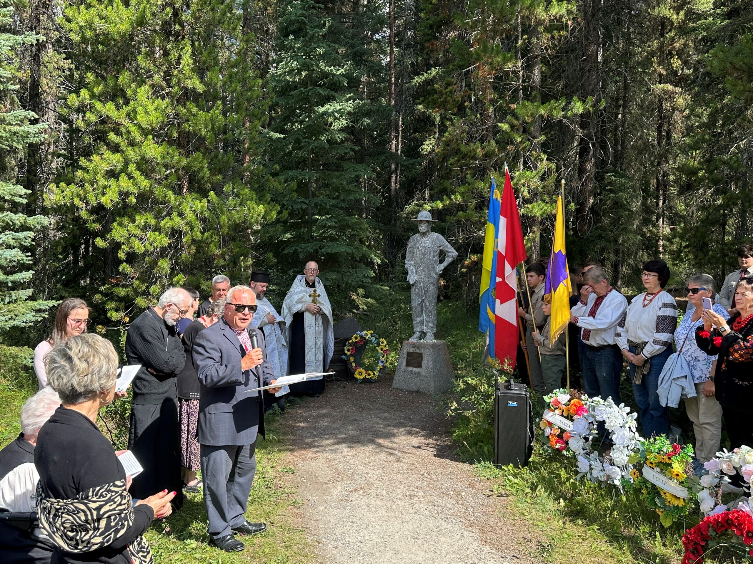 The Ukrainian Canadian Civil Liberties Foundation (UCCLF) organized the 30th anniversary of the installation of the commemorative statue and plaque at Castle Mountain in Banff National Park, on August 9, 2025. More than 50 people, from the Calgary and Banff area, attended the event.