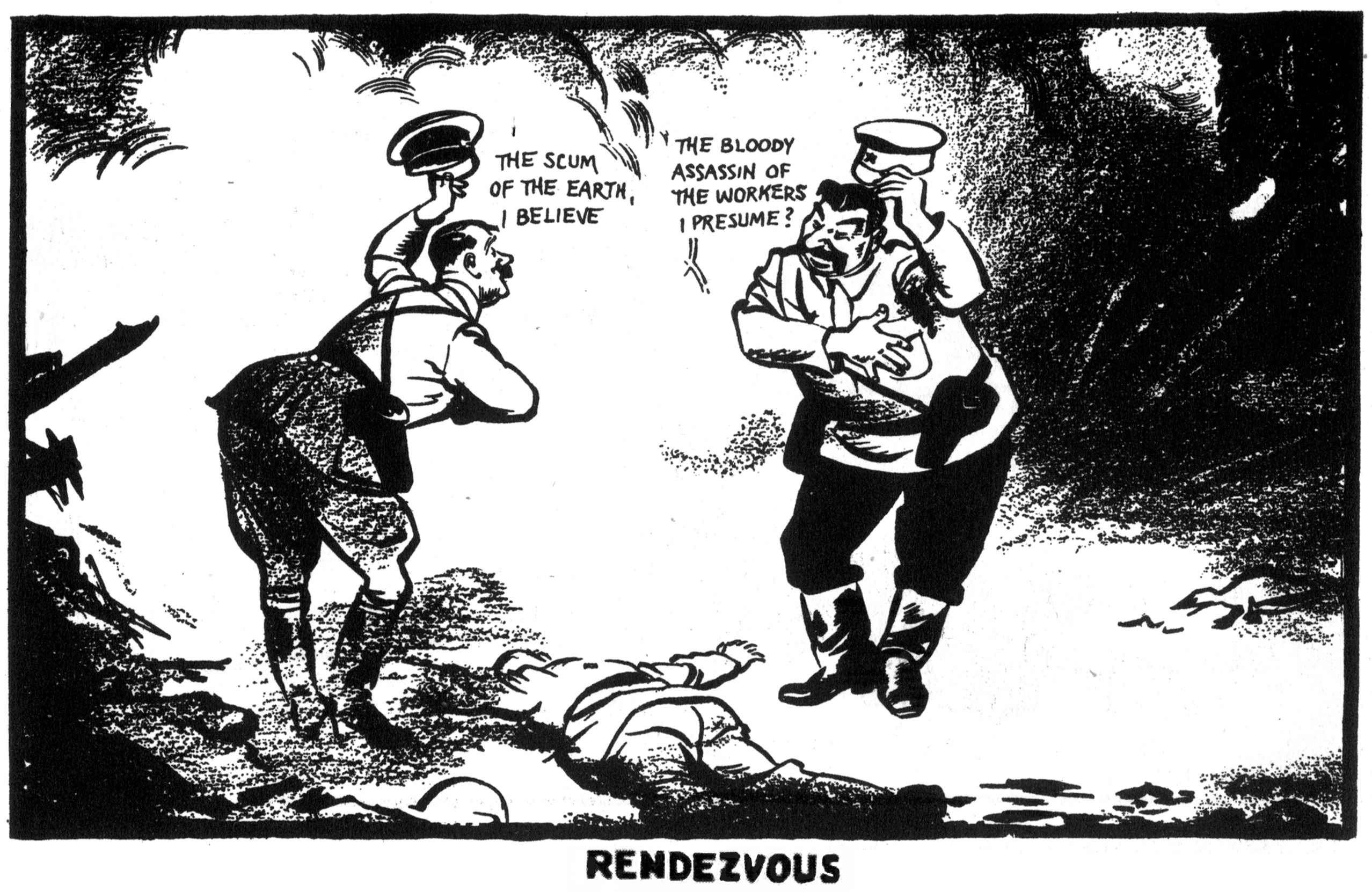 “Rendezvous”, a September 20, 1939, cartoon by David Low in the British newspaper, Evening Standard, satirizing the Hitler-Stalin Pact, which led to the invasions of then Poland from both sides and the start of World War II.