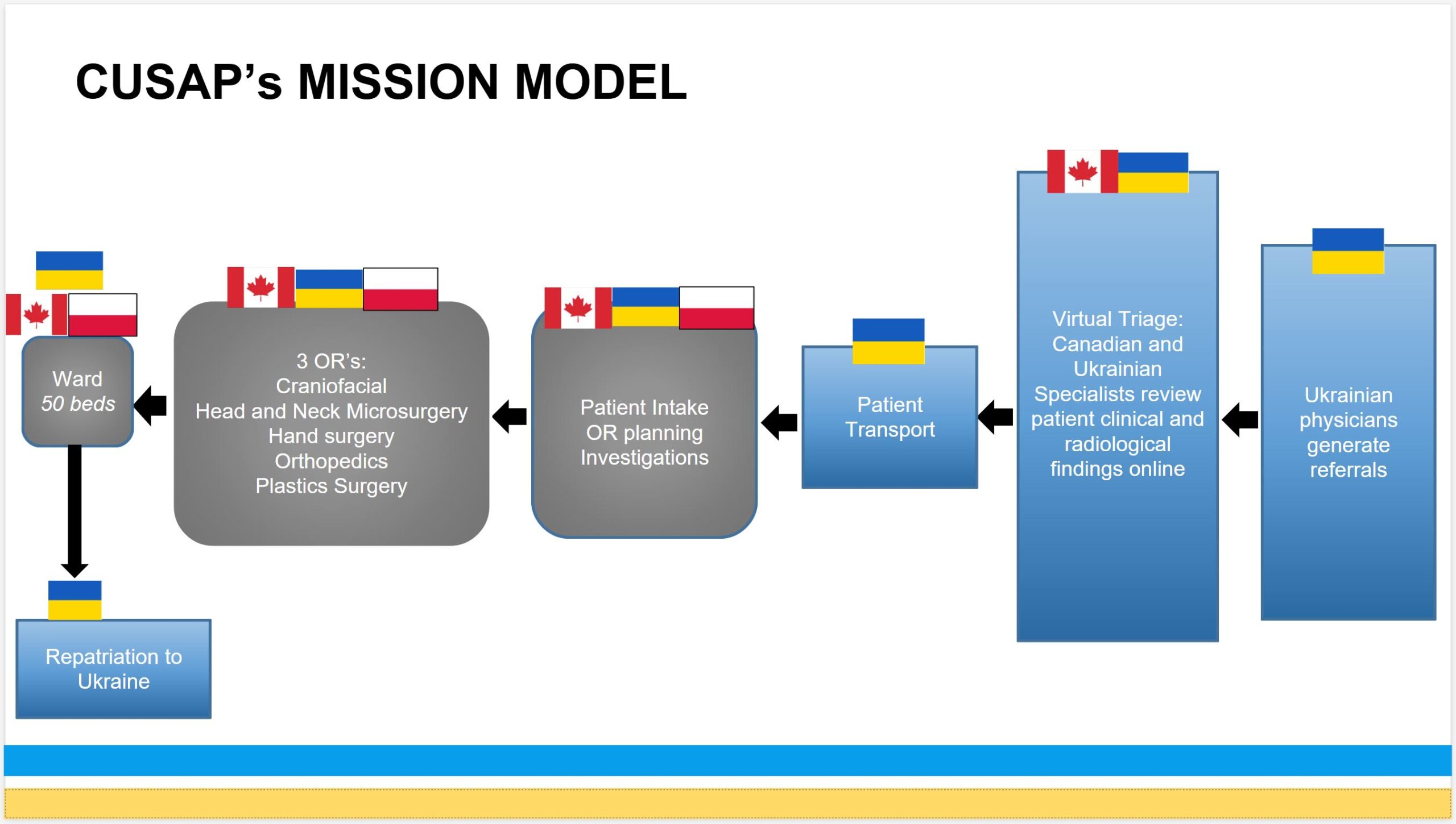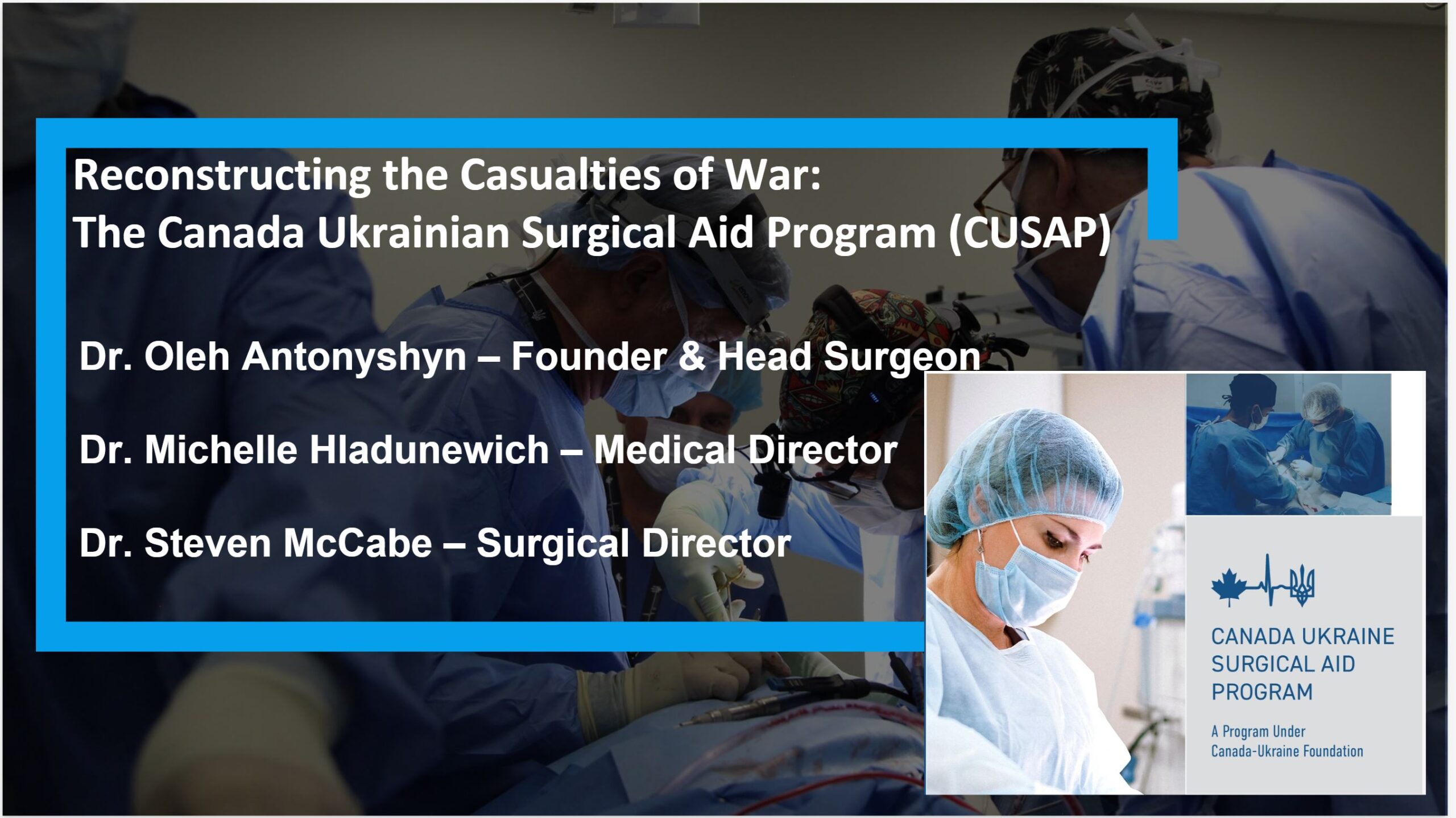 КУФ була створена для координації, розвитку і здійснення гуманітарної допомоги Україні: від продуктів і ліків до медичного обладнання, допомоги в охороні ментального здоров’я та медичних місій. Програма CUSAP – відповідь на потребу лікувати найбільш важкі травми війни, зокрема відкриті, контаміновані поранення ветеранів і цивільних українців, які потребують багатоетапної реконструкції. CUSAP стартувала в березні 2022 року після консультацій із МОЗ України та колегами-хірургами, аби закрити «довгу хвилю» посттравматичних дефектів і деформацій. Її подвійна мета: (1) надання складної реконструктивної допомоги постраждалим і (2) навчання українських лікарів через платформу SUSEI (Sunnybrook Ukraine Surgical Education Initiative).