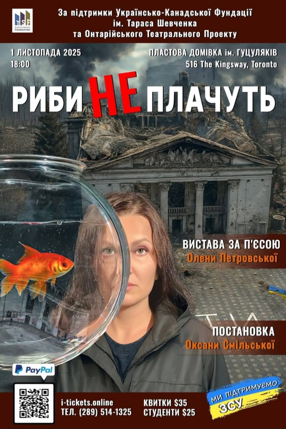 Постановка відбулася за підтримки Українсько-Канадської Фундації ім. Тараса Шевченка та Онтарійського Театрального Проєкту, що продовжує розвивати українське сценічне мистецтво в Онтаріо. Організатори подякували глядачам, які прийшли підтримати митців, а також усім, хто долучився до створення цього проєкту. Вистава присвячена тим, хто залишився людьми навіть тоді, коли світ довкола втратив людяність. «Риби не плачуть» це не просто театральна історія. Це крик душі, що звучить тихо, але глибоко. Це пам’ять, перевтілена у мистецтво. І саме такі постановки доводять: український театр у Канаді не лише зберігає, а й розвиває власну культурну мову, стаючи дзеркалом болю, сили та краси народу.
