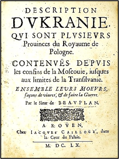 In fact, “Beauplan,” a surname in French meaning something like “beautiful map,” was probably accorded him, or taken on by him, for his pioneering work on Ukrainian cartography or engineering. (He had also designed several royal fortresses across Ukraine.) His full name, so far as we know, was “Guillaume le Vasseur Sieur de Beauplan.” “Le Vasseur” was probably his original surname; but that was in a century when surnames were still quite malleable for persons of non-noble background. “Vasseur” in French means “vassal” originally a rank somewhat below that of a baron.