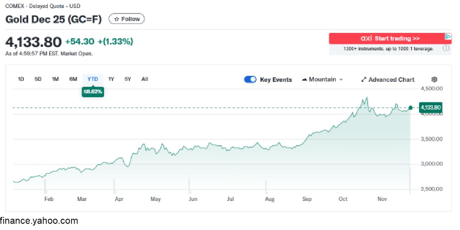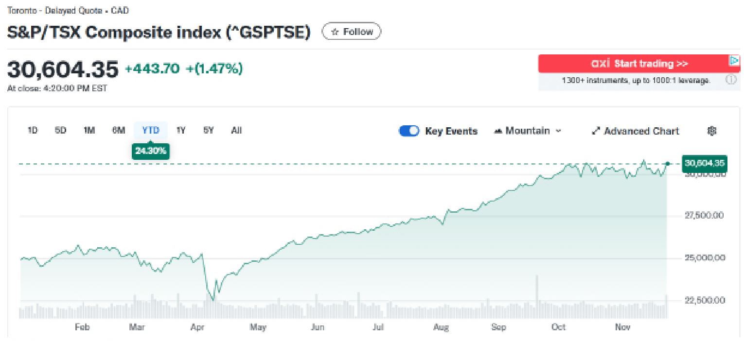 Year to date, Canada’s S&P/TSX Composite is up roughly 24%, rising from 24,728 at the end of 2024 to around 30,600 in late November. On November 12 it set a record closing high of 30,827.60. The U.S. S&P 500 is up about 14% over the same stretch. That’s a difference of roughly 10 percentage points in Canada’s favor.
