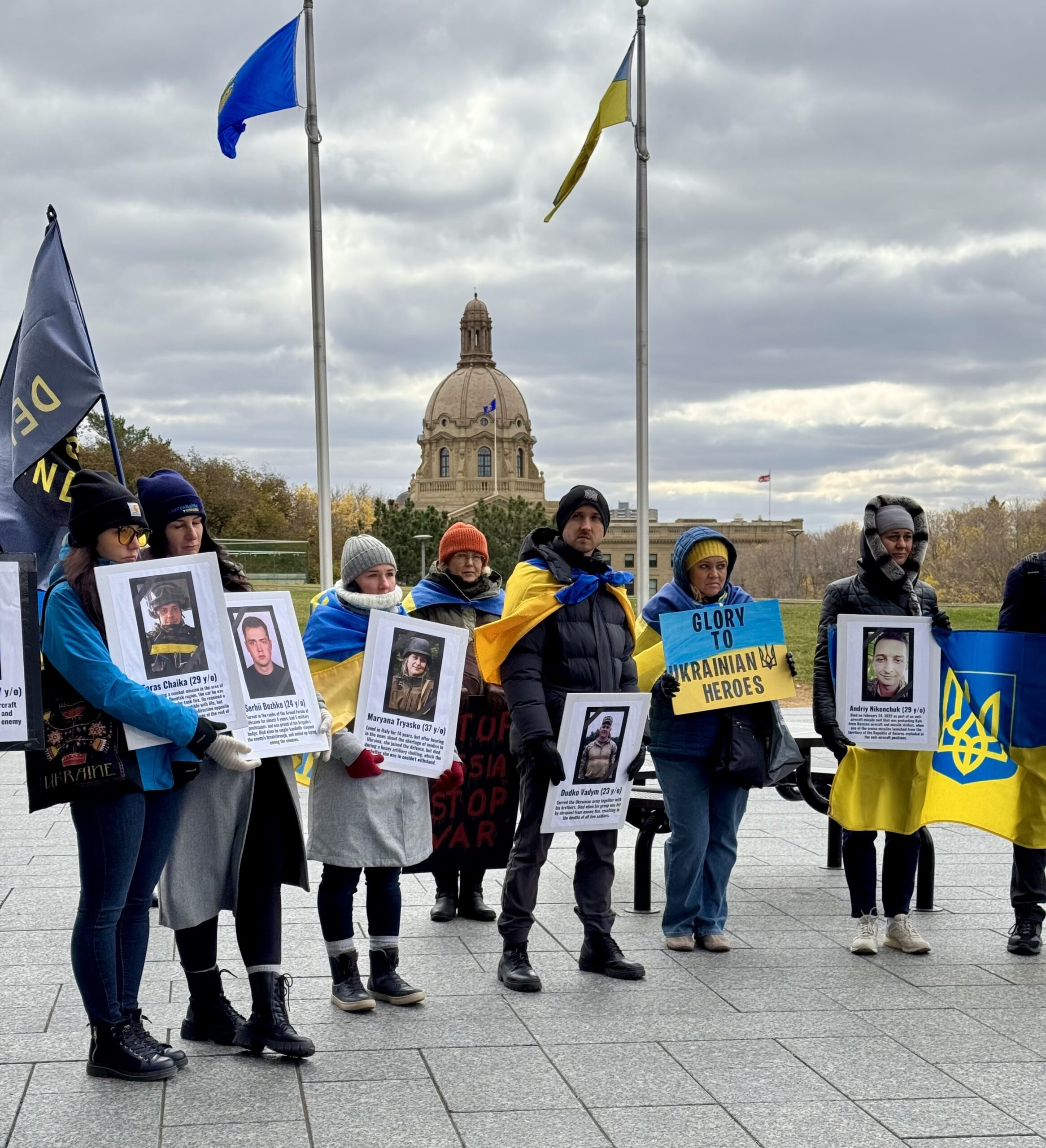 Один з мітингів відбувся всередині жовтня. У вітряну неділю 12 жовтня українська громада м.Едмонтон долучилася до ходи, присвяченої Дню захисника та захисниці України. Учасники пройшли маршрутом від Violet King Henry Plaza по 109 Street, несучи портрети тих, хто віддав життя у війні проти росії. Українські військові щодня виконують роботу, яка дозволяє мільйонам цивільних спати спокійно та жити звичним життям — саме завдяки їм Україна продовжує боротися й існувати попри всі труднощі. Вони тримають лінію оборони в умовах, коли бракує всього — від боєприпасів до часу на відпочинок, і багато з них служать уже четвертий рік поспіль.