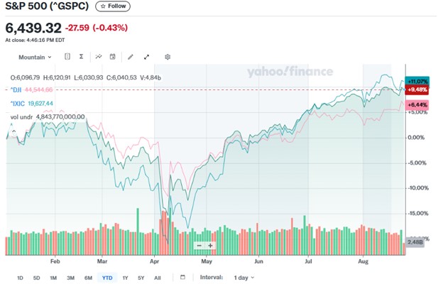 But the sell off proved temporary. By August 25, the S&P 500 had climbed to 6 439, the Dow had reached 45 282, and the Nasdaq stood at 21 449. From those April lows, gains had totaled approximately 27 percent for the S&P 500, 18 percent for the Dow, and 38 percent for the Nasdaq.